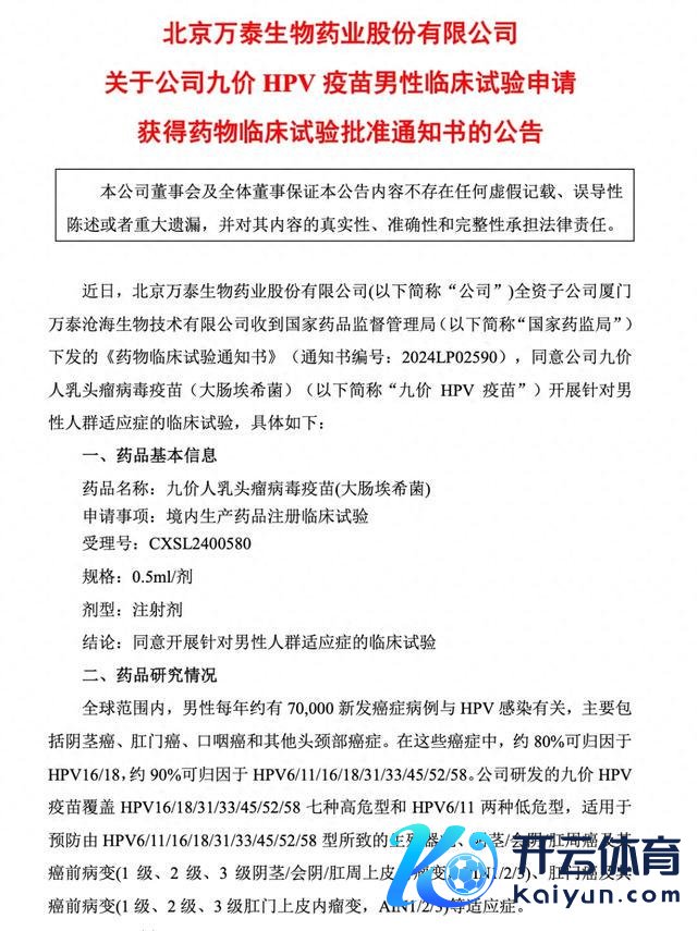 算作国内首家杀青二价HPV疫苗国产的企业,万泰生物于近日发布公告暗示,其子公司厦门万泰沧海生物时间有限公司已收到国度药监局下发的《药物临床历练见告书》,应许其九价HPV疫苗开展针对男性东说念主群安妥证的临床历练。